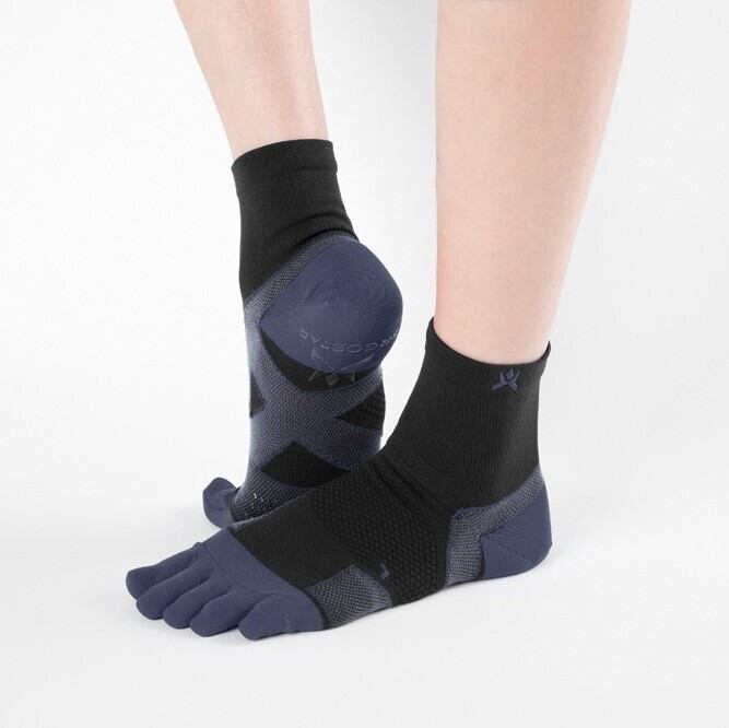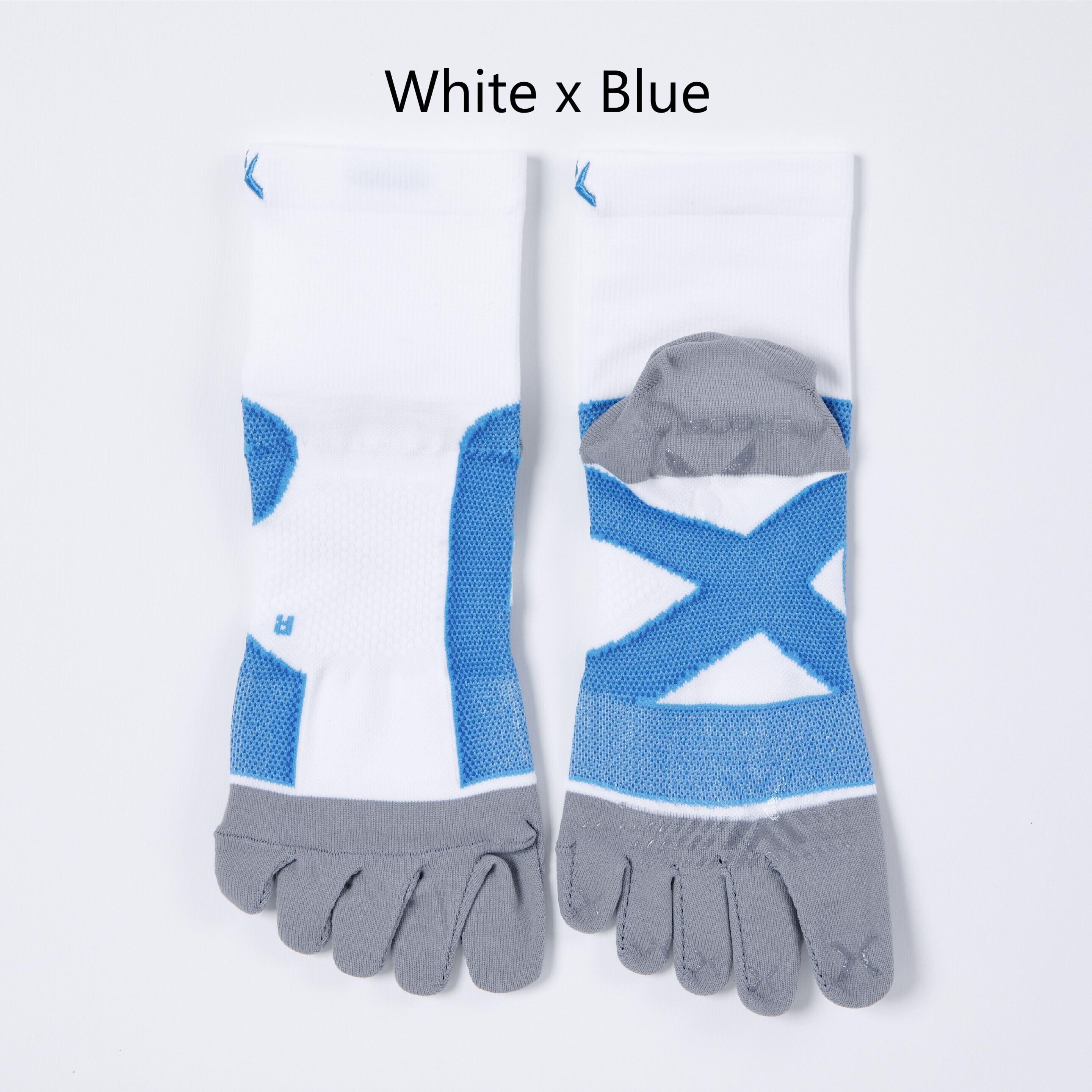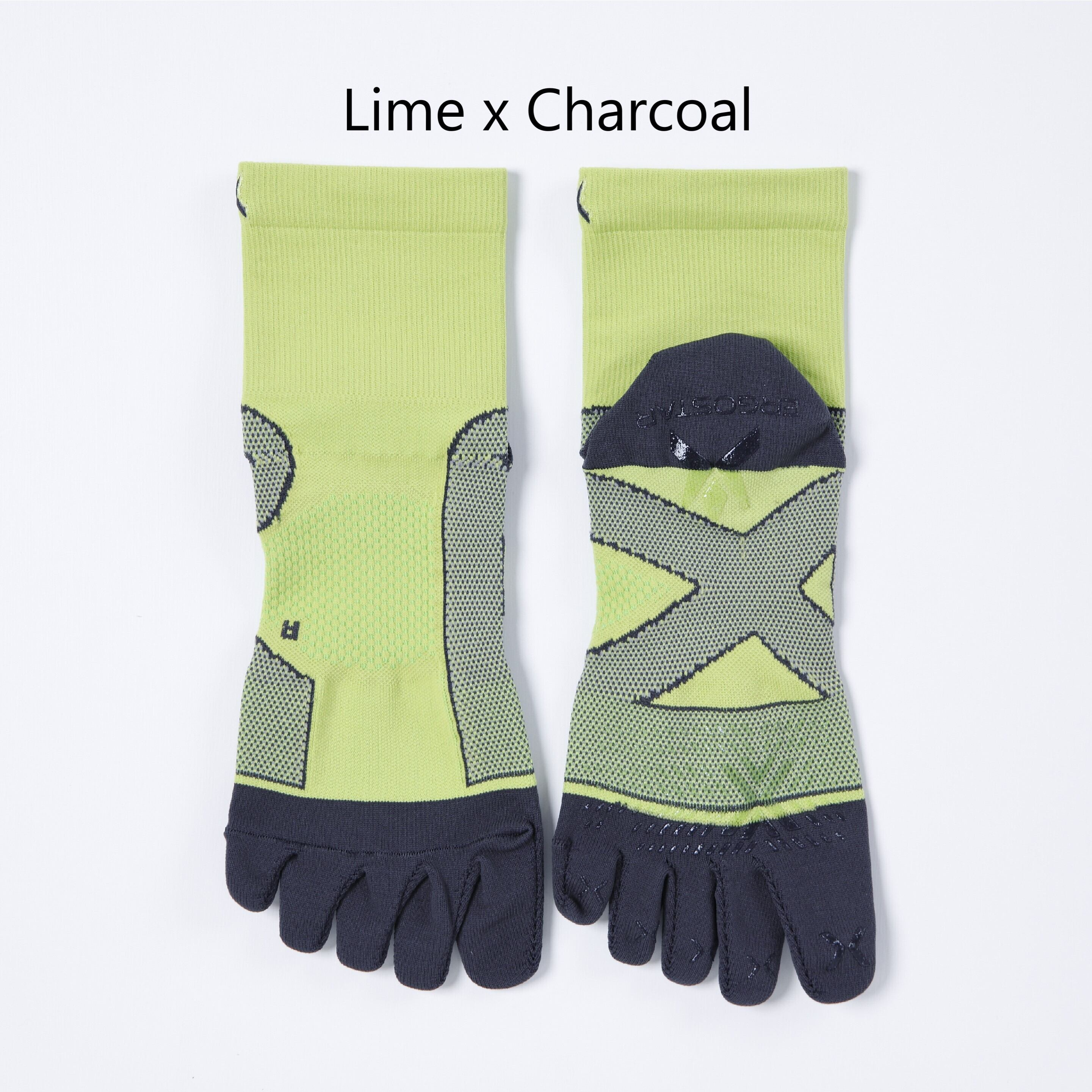 The short-length model of Cross-Taping Socks. It is designed with a 5-toe type that allows you to make use of your toe sensation, preventing skin problems caused by friction and moisture between the toes. The material is made of durable nylon, and the upper part of the sock features a mesh design, providing excellent breathability.
